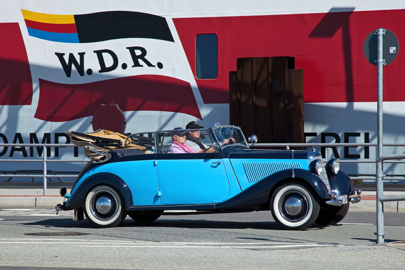 | Ein schöner alter Mercedes mit seinen stolzen Besitzern vor der großen W.D.R.-Flagge. Dagebüll Mole, 12. August 2012 |