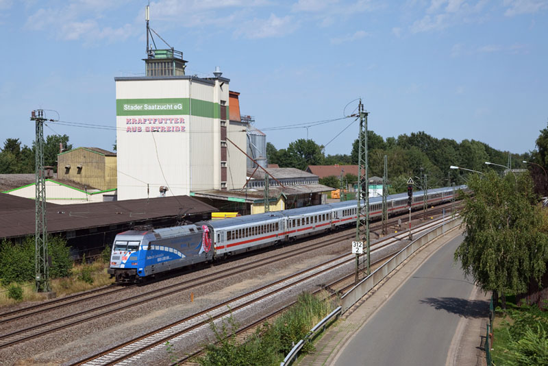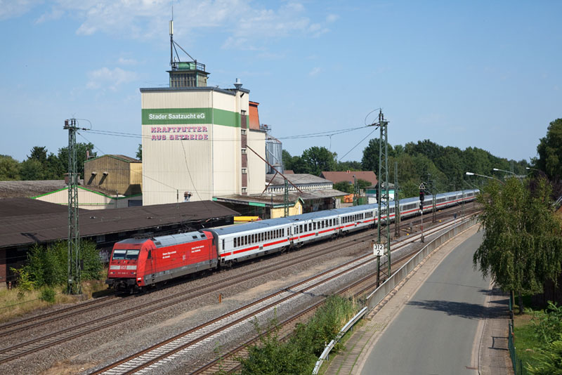 | Der InterCity 2311 ins Ruhrgebiet mit der 101 066-9, die noch die "PEP-Reklame" trägt. Tostedt, 19. August 2012 |