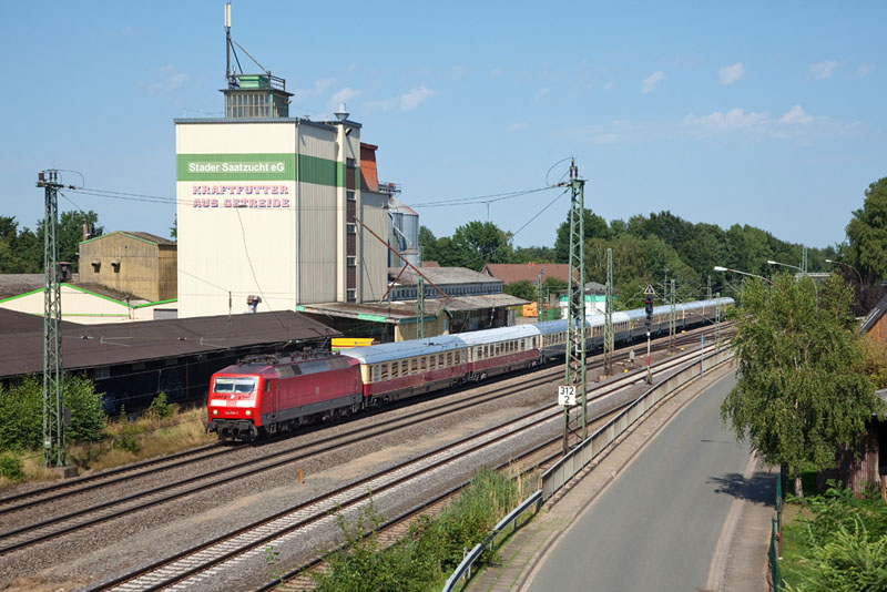 | Der historische InterCity 2417 von Flensburg nach Köln mit der 120 156-5. Tostedt, 19. August 2012 |