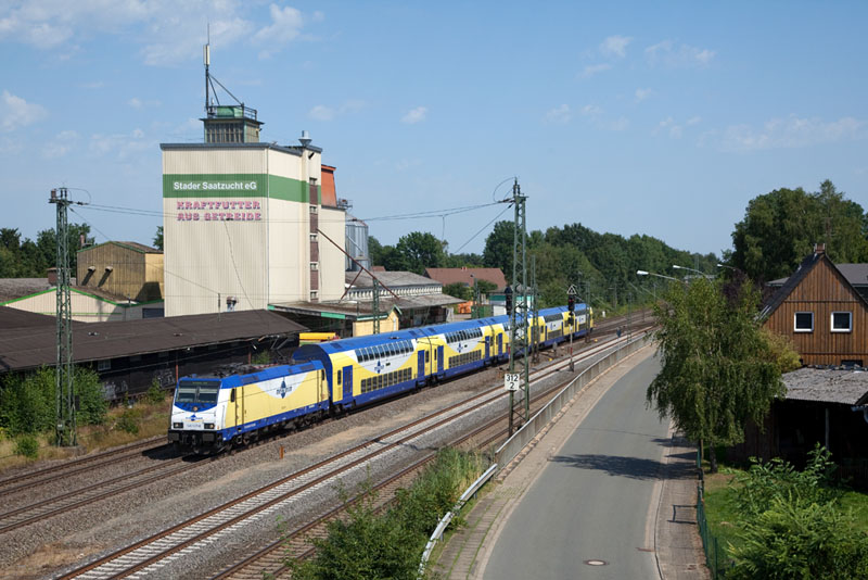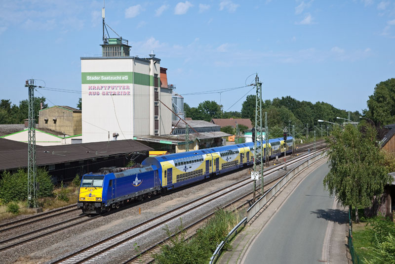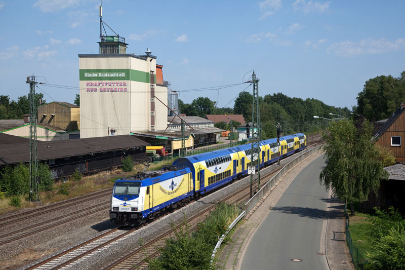| Mit einem metronom Regional nach Bremen fuhr die 146 537-6 ein. Tostedt, 19. August 2012 |