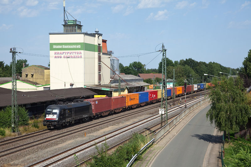 | Die für die TX Logistik fahrende ES 64 U2-098 der MRCE mit einem Containerzug. Tostedt, 19. August 2012 |