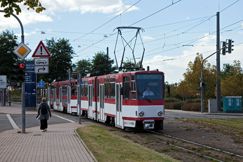 | Wunderbar, die selten gewordenen TATRA KT4D auf der Linie 2 – Tw 490 + Tw 450 bei der Fahrt stadteinwärts. Messe Erfurt, 19. September 2012 |