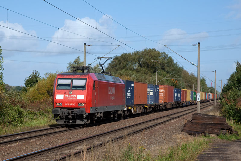 | Die 145 071-7 mit einem Containerzug aus dem Hafen. Hamburg-Moorburg, 9. Oktober 2012 |