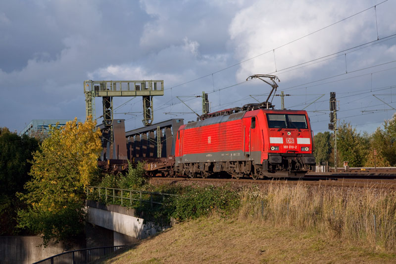 | Die 189 010-2 von DB Schenker mit einem gemischten Güterzug. Hamburg Süderelbbrücken, 9. Oktober 2012 |