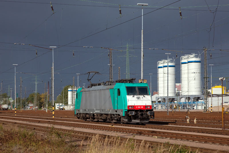 | Theaterlicht für die ebenso herein kommende E 186 126 der ITL – die nun seit Dez. 2012 in Polen fährt. Hamburg-Hohe Schaar, 9. Oktober 2012 |