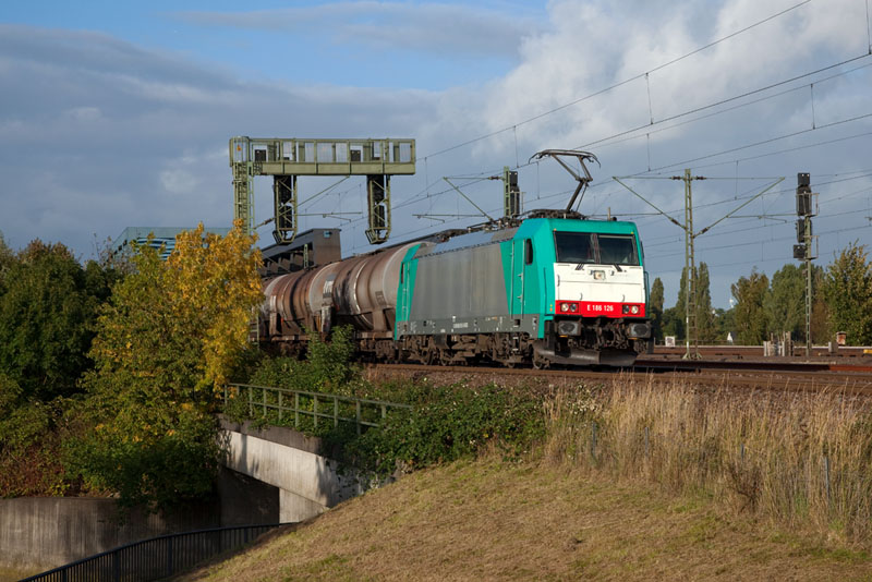 | So soll es sein, die E 186 126 ausfahrend mit einem Kesselwagenzug im besten Licht! Hamburg Süderelbbrücken, 9. Oktober 2012 |