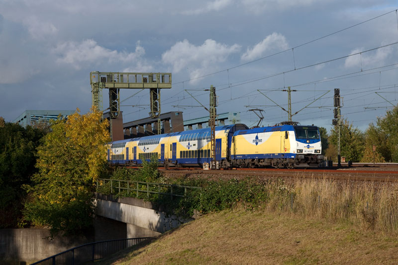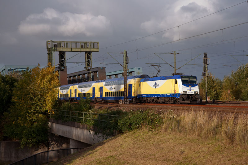 | Ein metronom Regional nach Rotenburg (Wümme) mit der 146 536-8. Hamburg Süderelbbrücken, 9. Oktober 2012 |