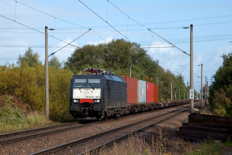 | Einen fast leeren Containerzug hatte die ES 64 F4-843, im Einsatz für DB Schenker, am Haken. Hamburg-Moorburg, 9. Oktober 2012 |