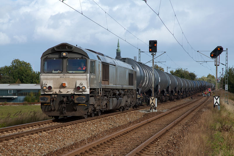| Wenig später kam dieser lange Kesselwagenzug mit der Class 66, die 266 036-3 der MRCE, herein. Hamburg-Hohe Schaar, 9. Oktober 2012 |
