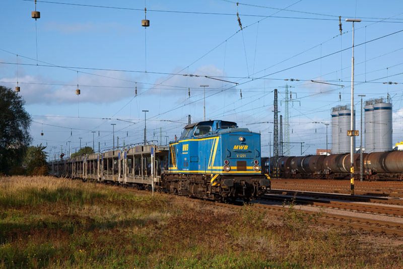 | Einen langen Autologistikzug der BLG zog die V 1201 der MWB vom Autoterminal E.H. Harms. Hamburg-Hohe Schaar, 9. Oktober 2012 |