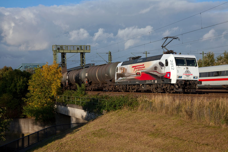 | Wenig später kam auch schon die PRESS-Lok 145 023-6 mit einem Kesselwagenzug. Hamburg Süderelbbrücken, 9. Oktober 2012 |
