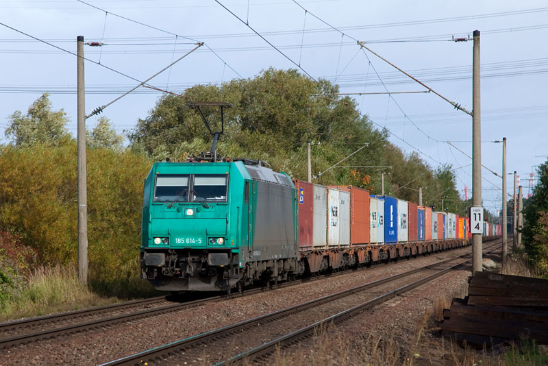 | Für die TX Logistik fahrende 185 614-5 mit einem gut gefüllten Containerzug aus dem Hafen. Hamburg-Moorburg, 9. Oktober 2012 |
