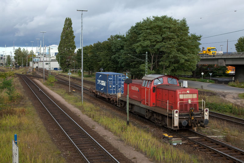 | Aus der "Schwarzen Ecke" hinter der A7 kam die 295 075-6 mit einem Containerwagen. Hamburg-Waltershof, 10. Oktober 2012 |