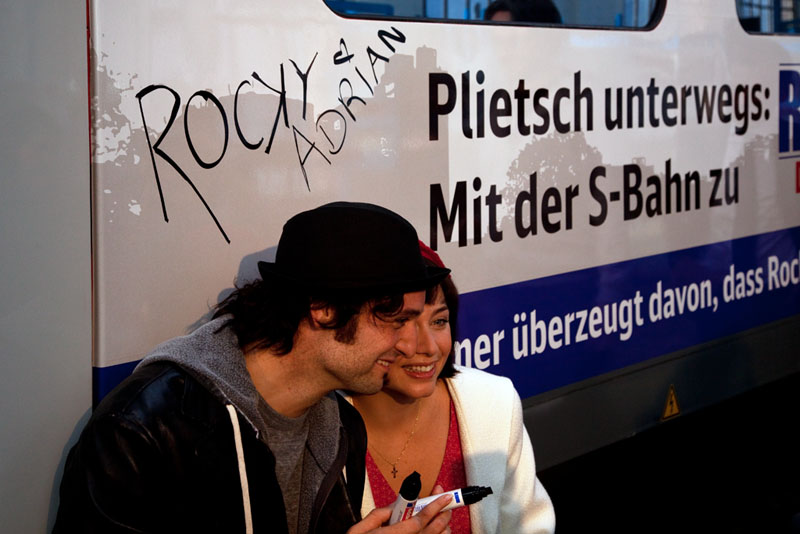 | Die beiden vor der neuen Werbe-S-Bahn "Rocky-Zug" – er natürlich in Boxerpose. Hamburg-Ohlsdorf, 10. Oktober 2012 |