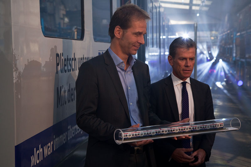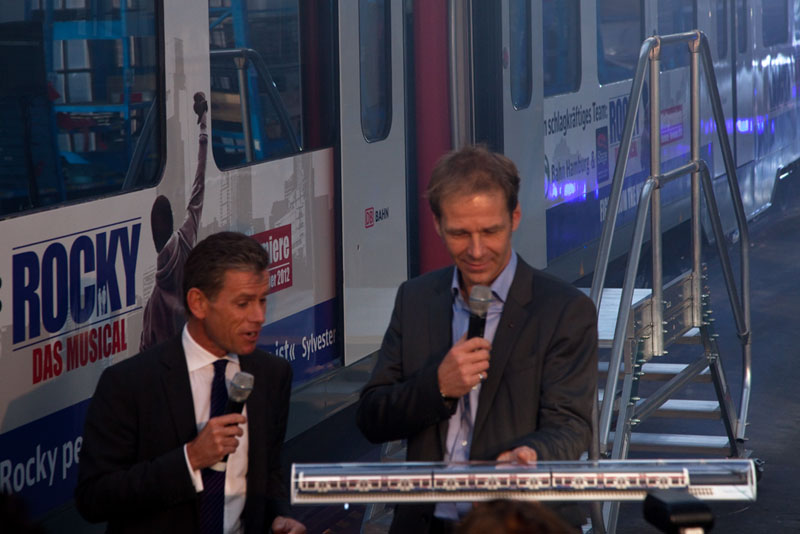 | Der Geschäftsführer von Stage Entertainment, Johannes Mock-O'Hara und der Sprecher der S-Bahn Hamburg, Kay Uwe Arnecke stellten den neuen "Rocky-Zug" vor. Hamburg-Moorburg, 9. Oktober 2012 | ||