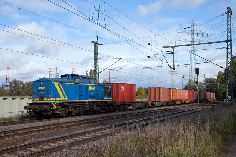 | Auch die V 1201 der MWB rangierte zwischen den Terminals in Waltershof. Hamburg-Waltershof, 10. Oktober 2012 |