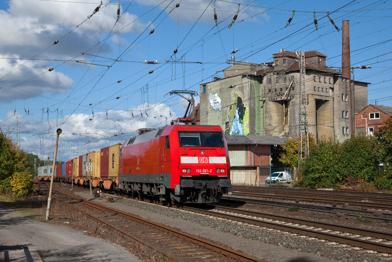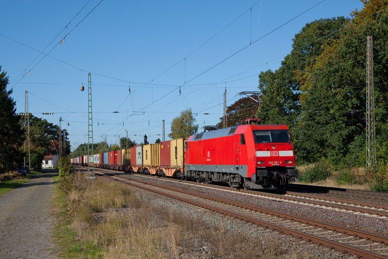 | Eine blitzblanke 152, die 152 021-2 mit einem Containerzug von Bremerhaven. Langwedel, 11. Oktober 2012 |