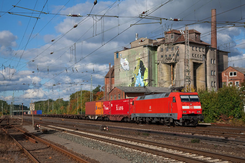 | Ein umgeleiteter Containerzug von Hamburg mit der 152 125-1 vor dem alten Kraftfuttersilo. Verden (Aller), 11. Oktober 2012 |