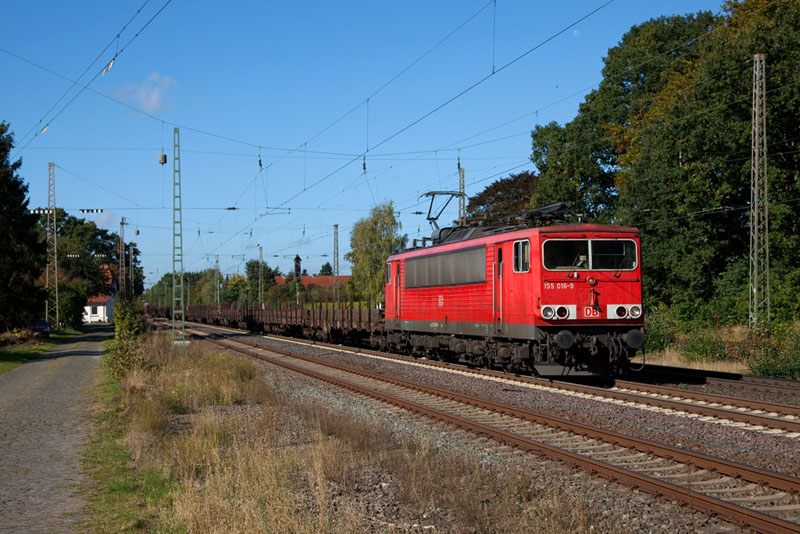 | Einen langen Rungenwagenzug hatte die 155 016-9 gen Süden zu bringen. Langwedel, 11. Oktober 2012 |
