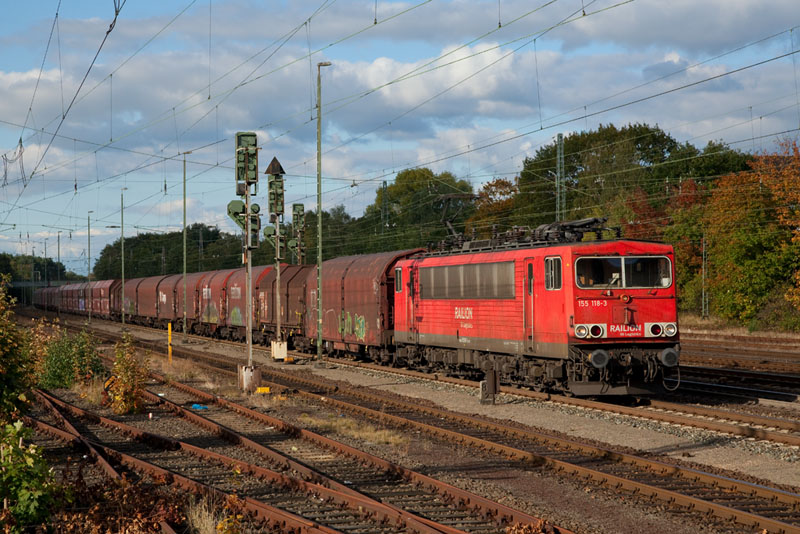 | Im letzten Sonnenlicht kam dieser schwere Güterzug der Montanindustrie mit der 155 118-3. Verden (Aller), 11. Oktober 2012 |