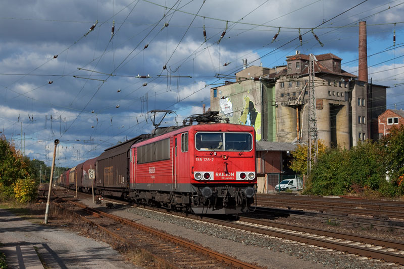 | Die sechsachsige 155 128-2 mit einem schweren Güterzug der Bremer Stahlindustrie. Verden (Aller), 11. Oktober 2012 |