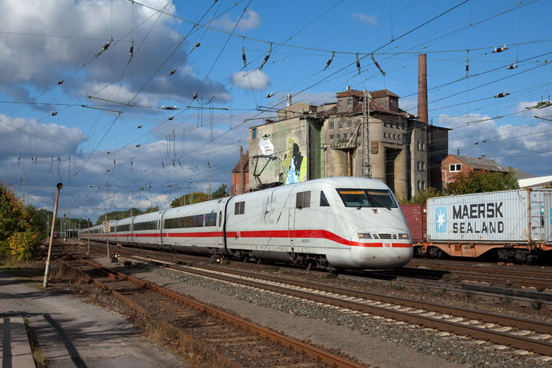 | Die Güterzüge dürfen warten, wenn ein umgeleiteter ICE von Hamburg via Rotenburg (Wümme) kommt – hier der Tz 179 als ICE 79 in die Schweiz. Verden (Aller), 11. Oktober 2012 | ||