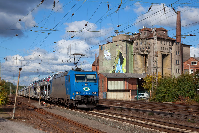 | Mit einem BLG Autologistikzug von Bremerhaven donnerte die 185 519-6 südwärts durch. Verden (Aller), 11. Oktober 2012 |