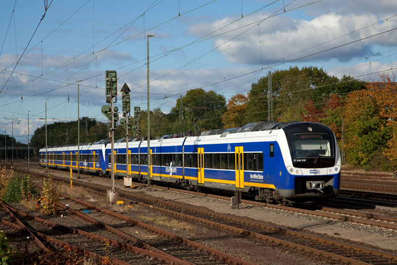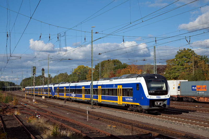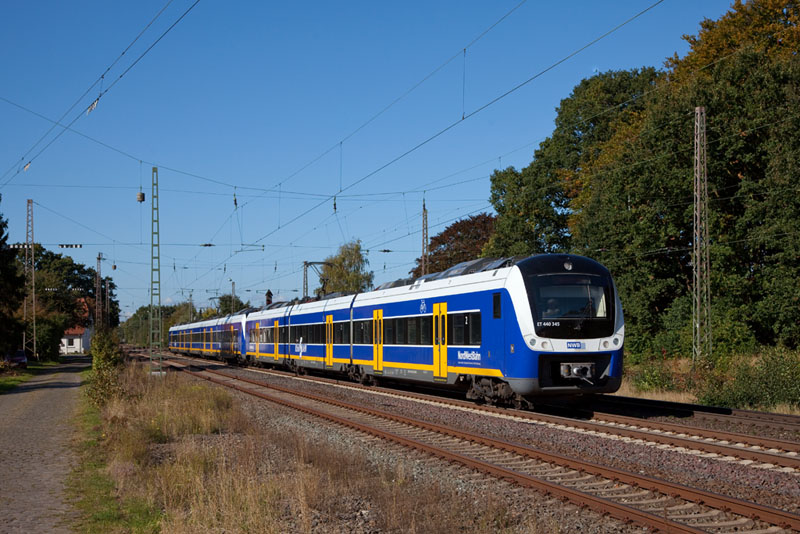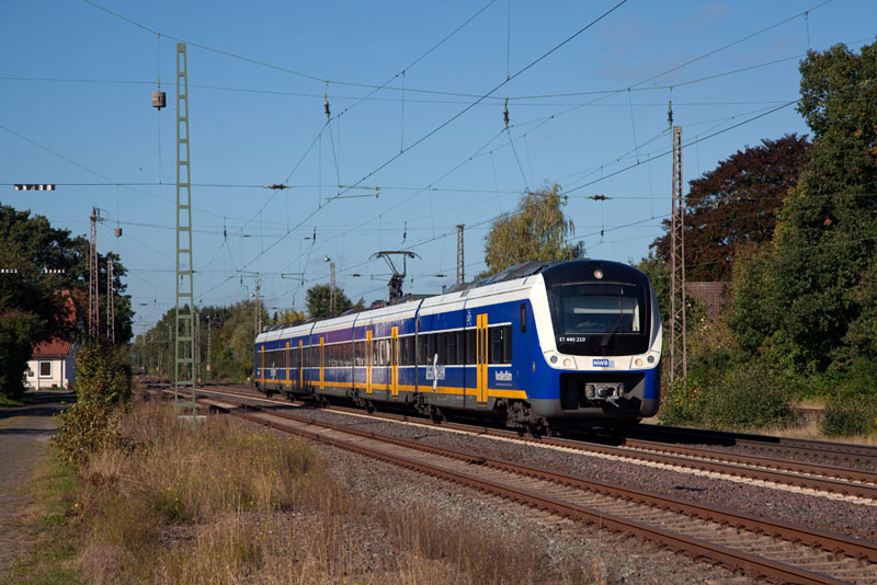 | Die nächste Regio-S-Bahn nach Verden (Aller) mit dem ET 440 210 der NWB. Langwedel, 11. Oktober 2012 |