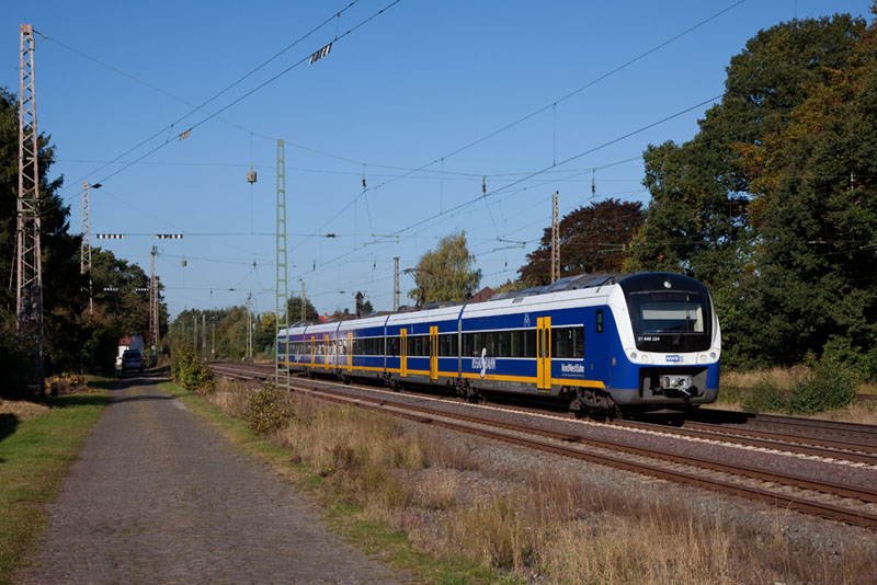| Die Bremer Regio-S-Bahn der NordWestBahn – ET 440 224 als RS2 nach Verden (Aller). Langwedel, 11. Oktober 2012 |