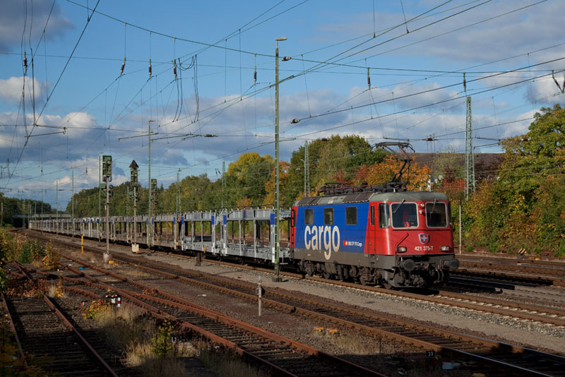 | Die schöne schweizer 421 375-7 mit einem BLG Autologistikleerzug. Verden (Aller), 11. Oktober 2012 |