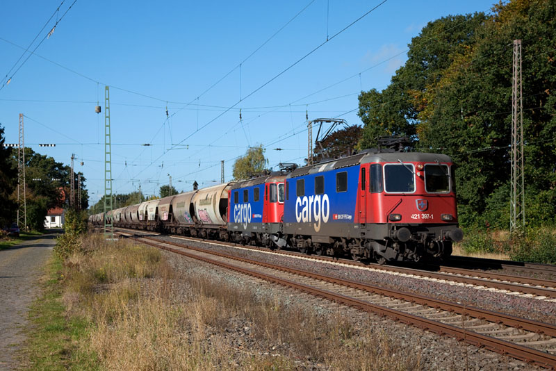 | Die Re4/4 421 397-1 der SBB Cargo hatte noch ihre Schwesterlok 421 383-1 und den Cerealienzug am Haken. Langwedel, 11. Oktober 2012 |