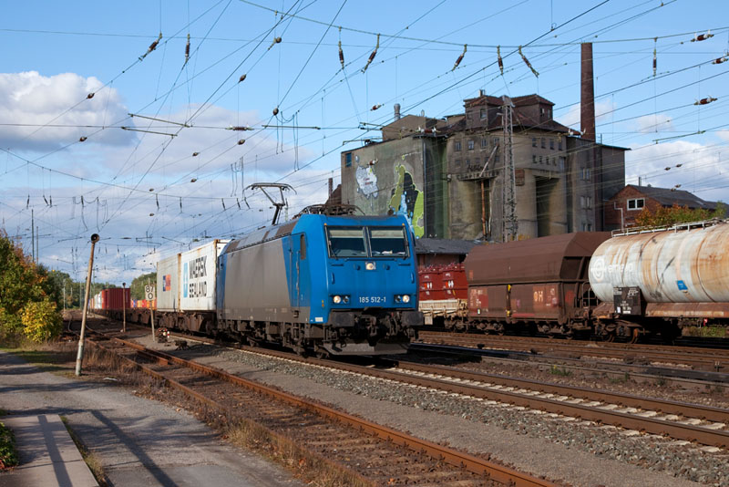| Die 185 512-1 im Einsatz für die TX Logistik mit einem Containerzug von den Bremer Häfen. Verden (Aller), 11. Oktober 2012 |