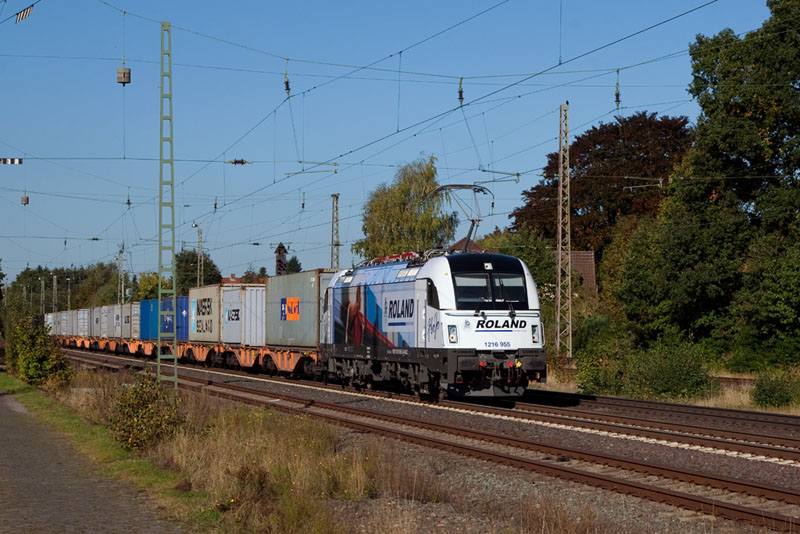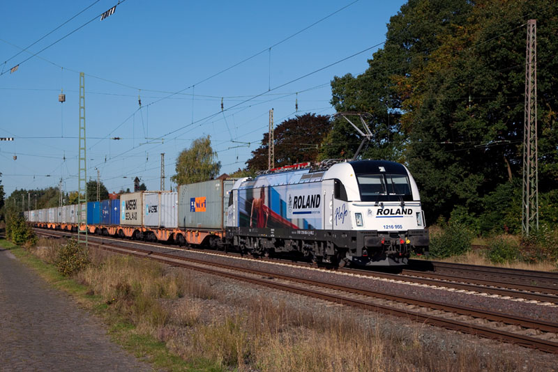 | Potzblitz! Die neue WLC-Werbelok "ROLAND", die 1216 955 mit dem Containerzug von Bremerhaven! Langwedel, 11. Oktober 2012 |
