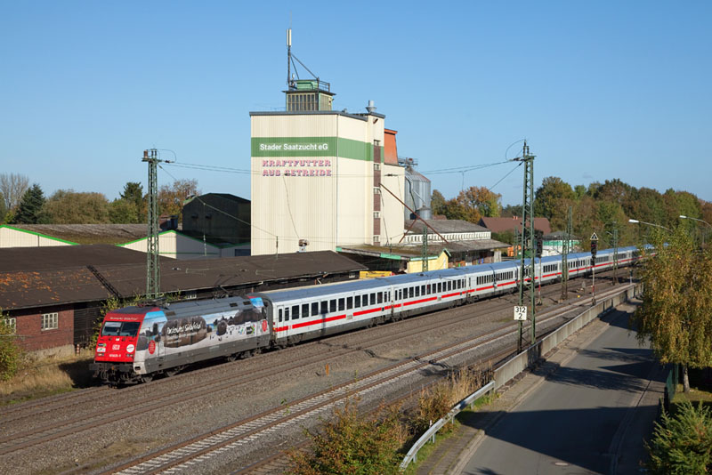 | "Packendes Südafrika"-Werbelok 101 025-5 mit dem InterCity 2027 nach Köln. Tostedt, 28. Oktober 2012 |