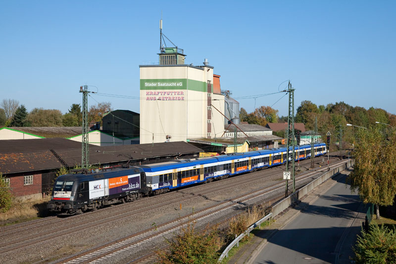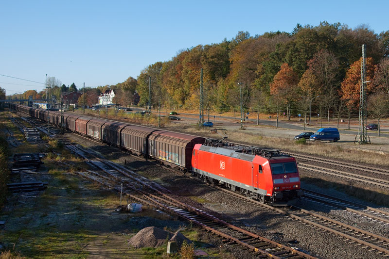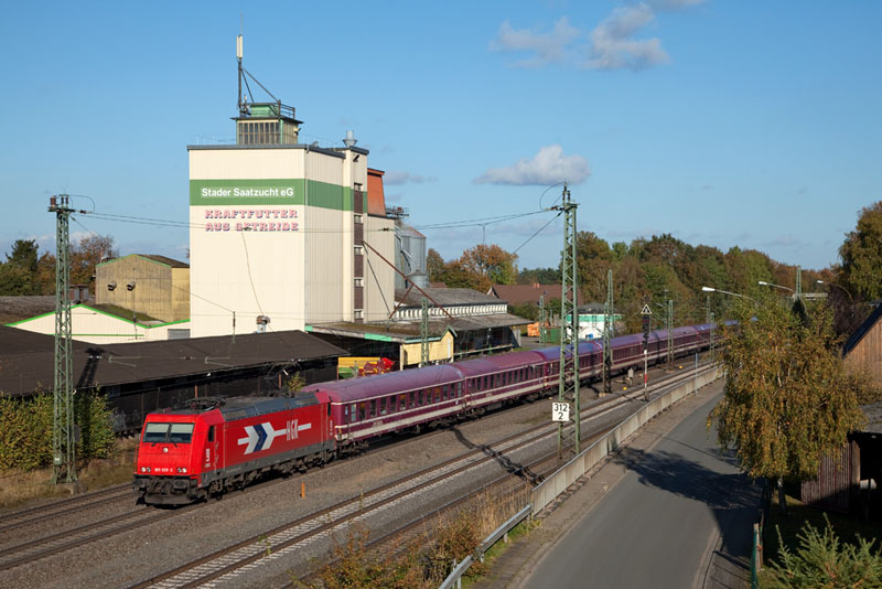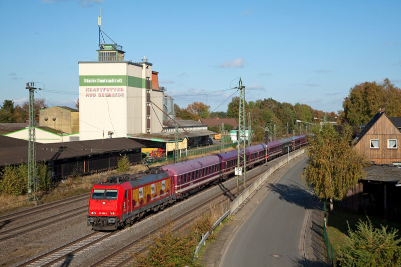 | Herbstzeit ist "Säuferzeit" – der "Müller"-Sonderzug DPE 1865 Lübeck - Köln mit der HGK 185 605-3. Tostedt, 28. Oktober 2012 |