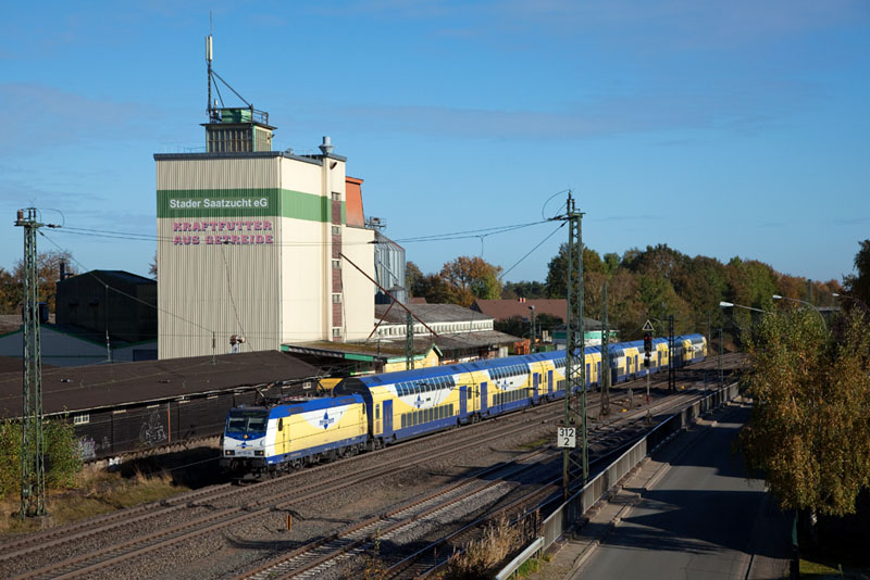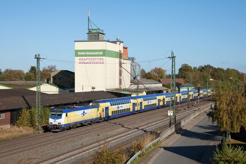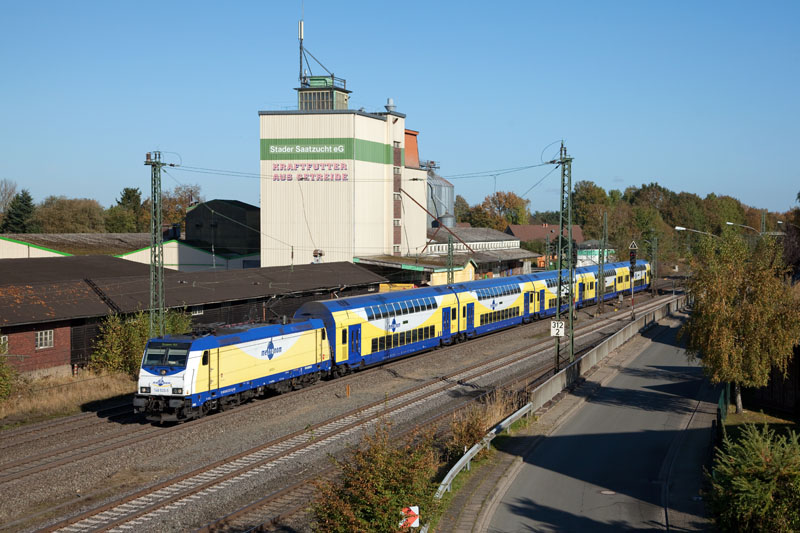 | Der metronom (quasi der Eilzug) nach Bremen mit der ME 146-02. Tostedt, 28. Oktober 2012 |
