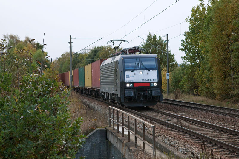 | Die schwarze Schwesterlok der BR 189, die ES 64 F4-157 mit dem neuen METRANS-Containerzug von München-Riem nach Hamburg-Waltershof. Hamburg-Moorburg, 2. November 2012 | ||