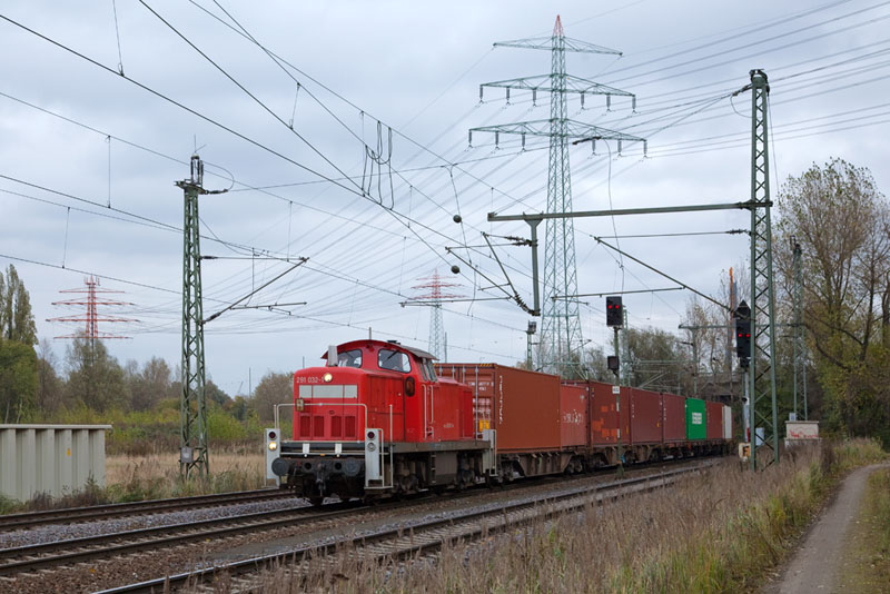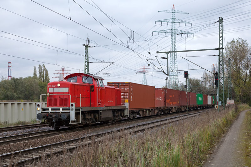 | Hauptsächlich sind aber die Rangierloks wie 291 032-1 zuständig die Züge von und zu den Terminals zu befördern. Hamburg-Waltershof, 2. November 2012 |