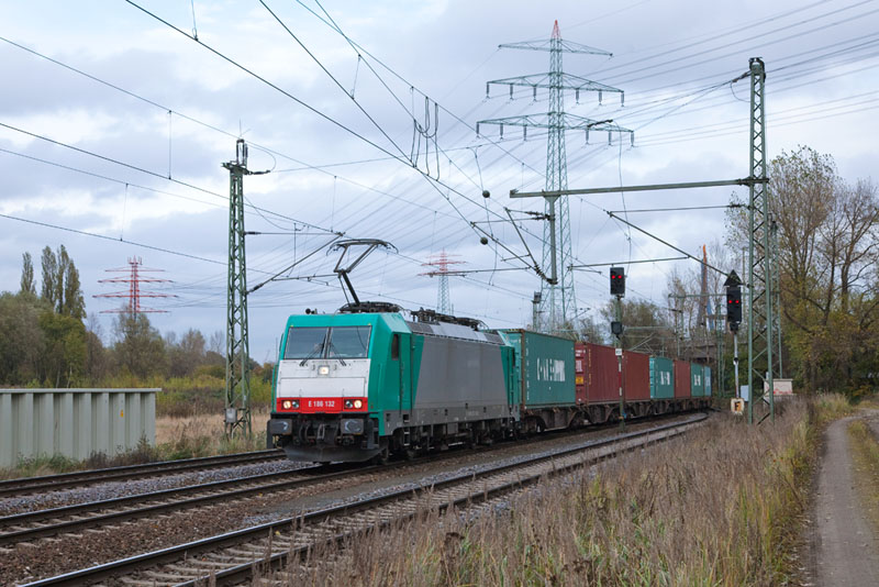| Ausfahrender Containerzug vom Burchardkai mit der E 186 132 der ITL. Hamburg-Waltershof, 2. November 2012 |