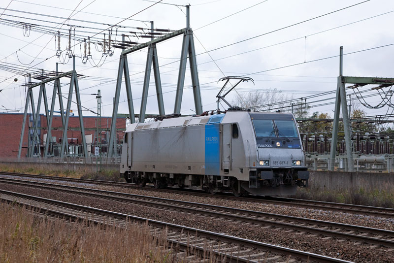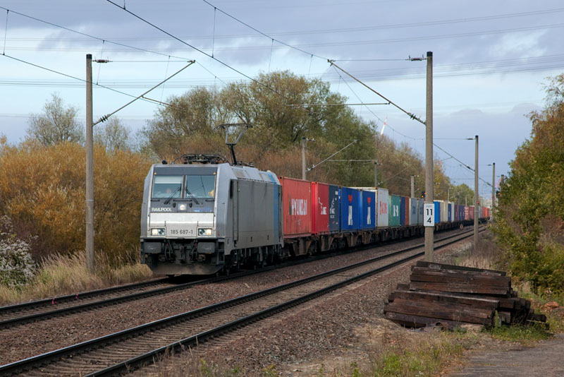 | Knapp einen Kilometer weiter südlich fuhr die 185 687-1 mit einem Containerzug aus. Hamburg-Moorburg, 2. November 2012 |
