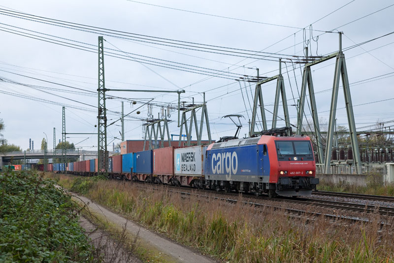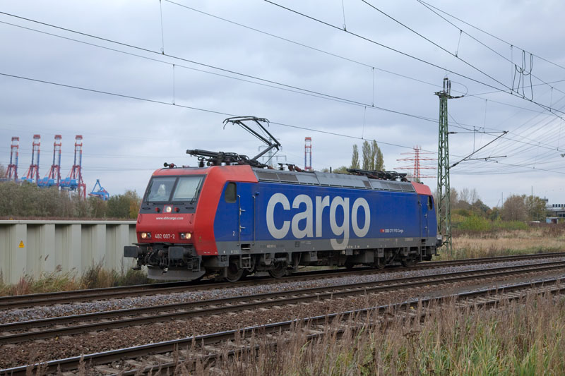 | Auch die 482 007-2 der SBB Cargo brachte Container direkt zu den Terminals. Hamburg-Waltershof, 2. November 2012 |