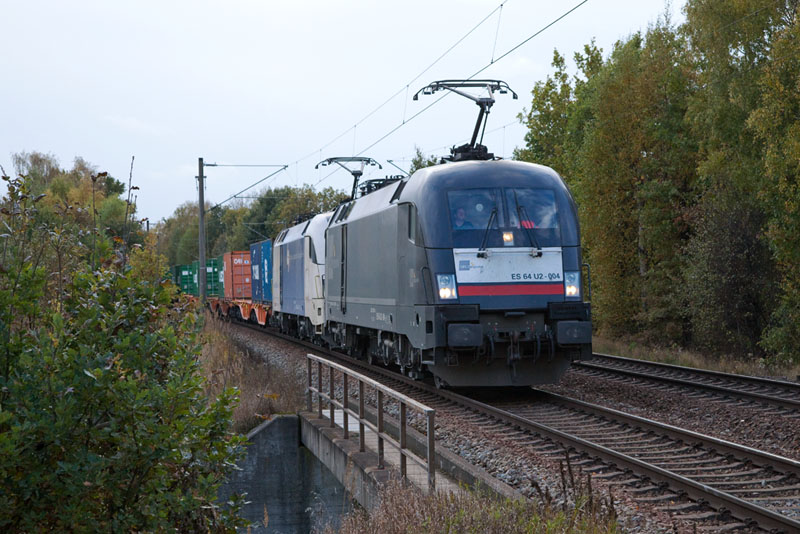 | Oh, ein Taurus-Tandem aus ES 64 U2-004 und ES 64 U2-021 der Wiener Lokalbahnen Cargo in den Hafen. Hamburg-Moorburg, 2. November 2012 |