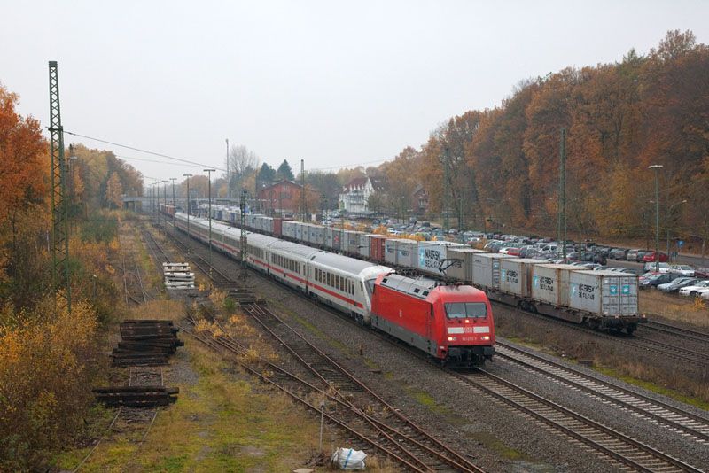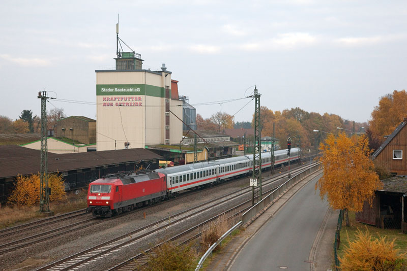 | In Tostedt brummte es, als der IC 2220 mit der 101 072-7 nach Hamburg durchrauschte. Tostedt, 9. November 2012 |