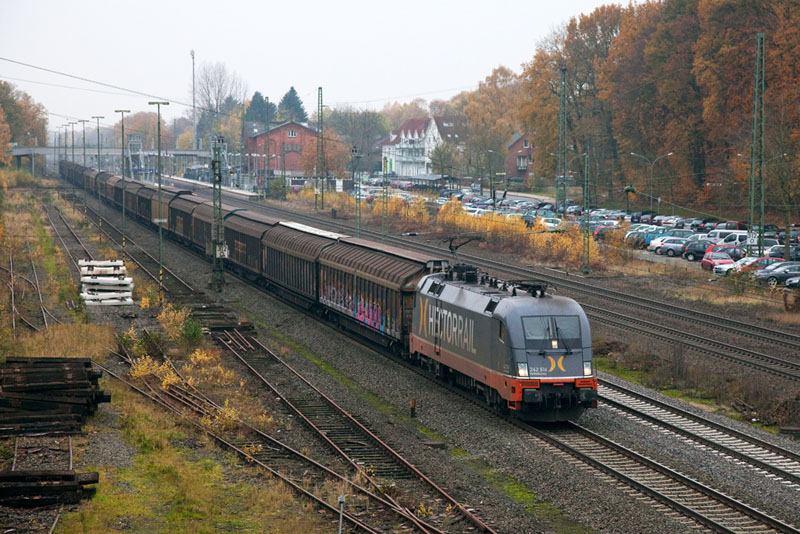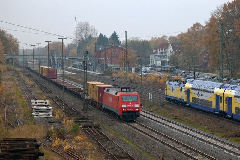 | Während ein metronom nach Bremen einfuhr, kam die 152 063-4 mit ihrem Containerzug nach Hamburg. Tostedt, 9. November 2012 |