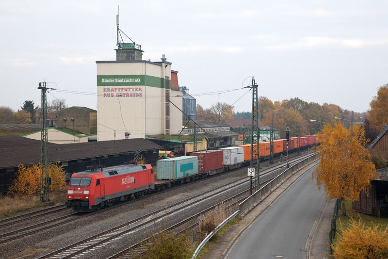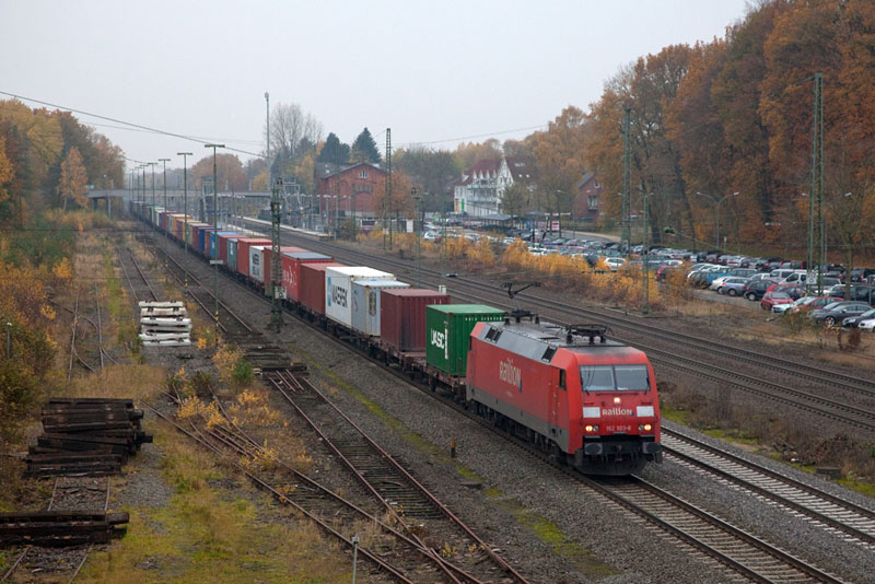 | In den Hamburger Hafen ging dieser Containerzug mit der 152 103-8. Tostedt, 9. November 2012 |