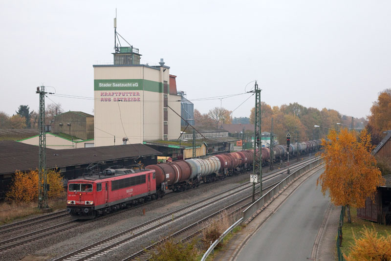 | Einen rassigen Kesselwagenzug hatte die 155 131-6 von Hamburg zu ziehen. Tostedt, 9. November 2012 |