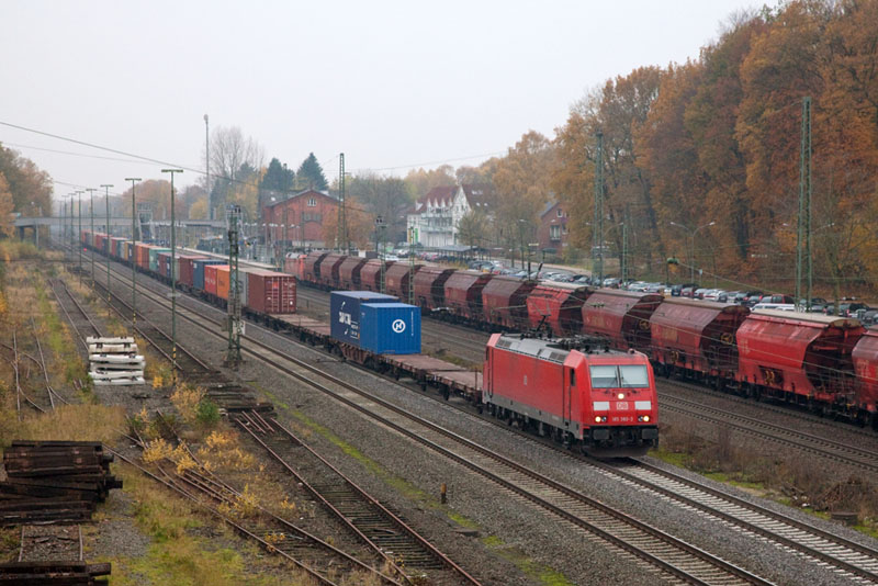 | Einen interessanten "Mohrenkopfzug" hatte die 185 189-8 am Haken. Tostedt, 9. November 2012 |