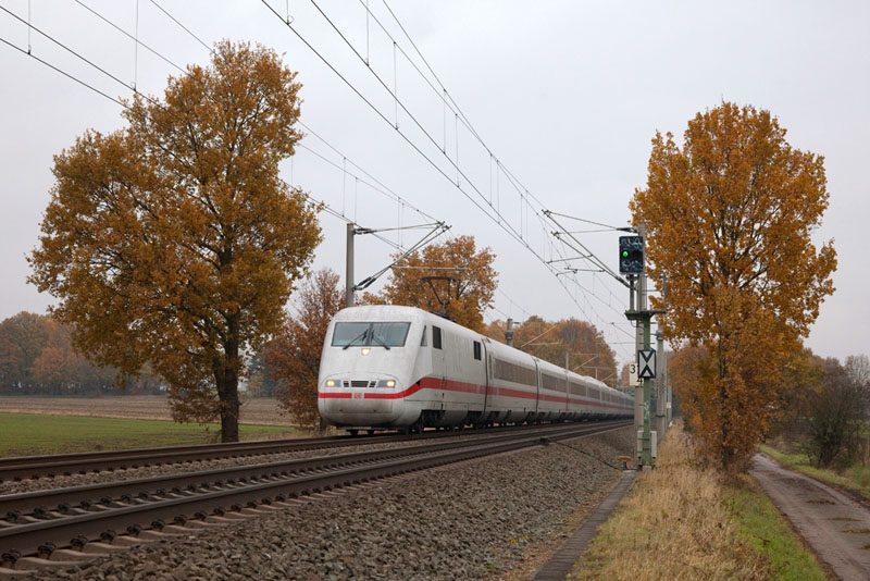| Der ICE-Triebzug 184 als umgeleiteter ICE 75 via Hannover nach Frankfurt/Main. Buensen, 9. November 2012 |