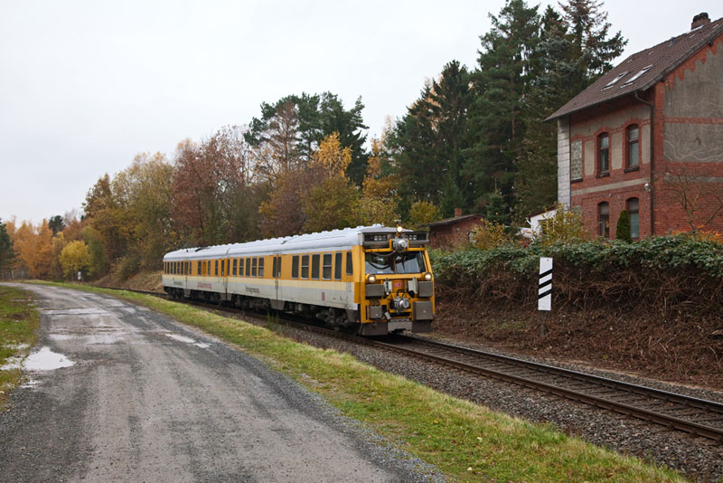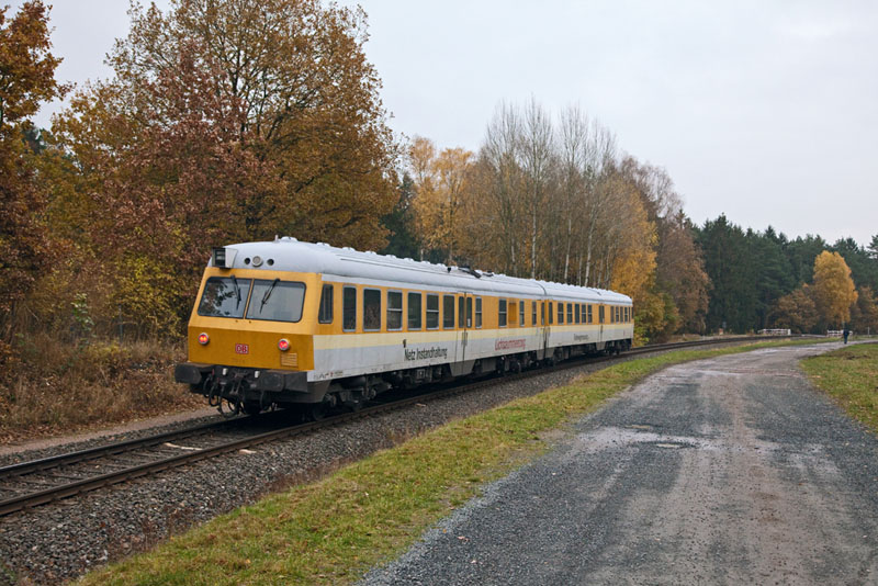 | Auf der Heidebahn fuhr der LIMEZ (Lichtraum-Messzug) 719 045/046 von DB Netz nach Soltau. Suerhop, 9. November 2012 |