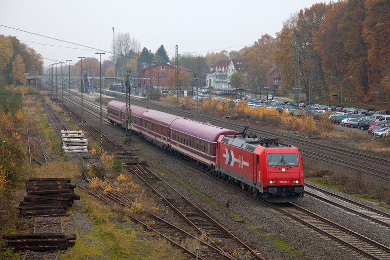 | Die 120 115-1 rauschte mit einem Leerreisezug in Richtung Bremen durch. Tostedt, 9. November 2012 |
